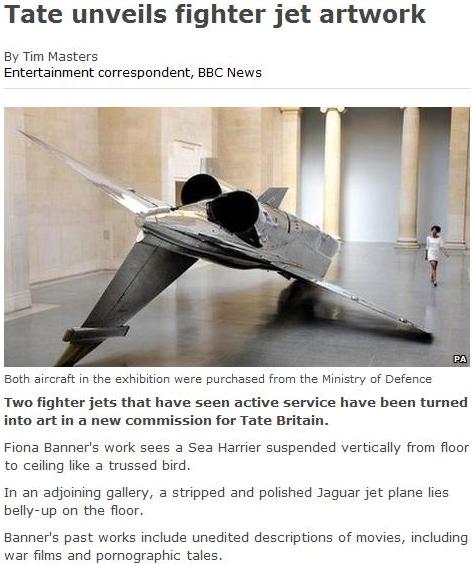 Fiona Banner they call this tart, who thinks it is soooooo clever to truss up a Sea Harrier, the type that helped save the Falklands, and much else besides. Now if they would truss her up and hang the stupid, vain bitch upside down from a lamppost, then that might not be art. But it would be a small compensation for the insult, and the offence she has given.