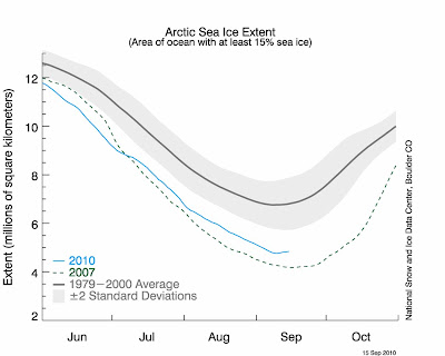 According to the National Snow and Ice Data Center, arctic sea ice appears to have reached its annual minimum extent on 10 September. The minimum ice extent was the third-lowest in the satellite record, after 2007 and 2008, the Center says, "and continues the trend of decreasing summer sea ice."