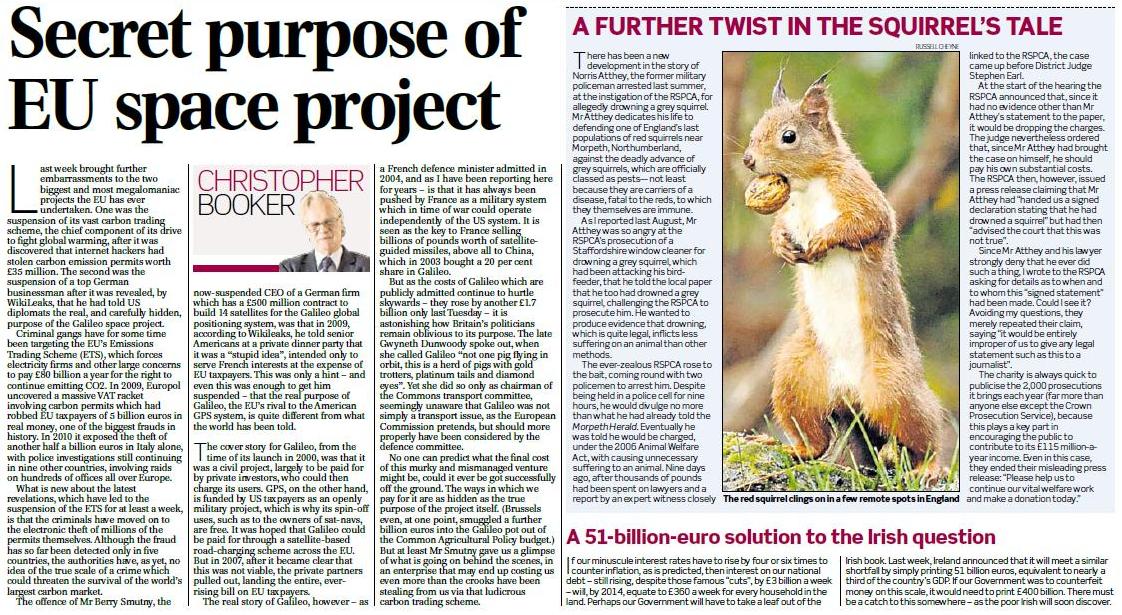 Two main offerings from the master scribe this week, one on EU megalomania - Galileo and carbon trading - and the other on another form of megalomania, the RSPCA and squirrels. Readers of this blog will be familiar with the EU stuff. The RSPCA is new, although one suspects that if there was an EU animal welfare agency, it would be modelled on the RSPCA and look very much like it.