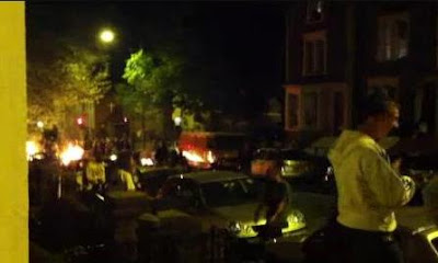 Not long after that, as far as I can tell, was when it became impossible to get through the street, as the police and the protestors became more heavy handed; with batons, bricks being thrown, more glass being smashed and injuries. Back home, we went on Twitter and Facebook and tried to follow what was happening. What was so striking was the utter confusion about what the riot was actually about. One person on Twitter said they were evicting squatters from a proposed Tesco site (I tweeted to say he was about a year late).The disturbences, however, spread south as far as City Road. There is a running battle on City Road, which penetrates the back streets on the eastern side of the main road, with a barricade and fire on the Brigstocke Road (picture below), just before the junction with Gwyn Street and Hepburn Road.