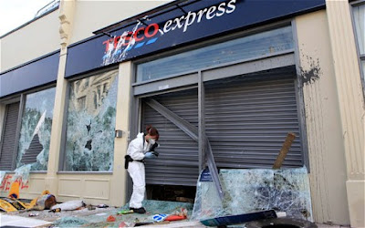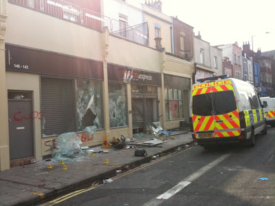 Celebrations broke out as the crowd realise they have the streets. Calls of "Smash Tesco!" ring out. Tesco windows are smashed (below) and the abandoned Land Rover Defender is also smashed. The trailer full of riot equipment is looted. The trailer is then detached and moved to the junction of Bath Buldings and Arley Hill, just north of the Tesco store, where it is overturned and used as part of a makeshift barricade.