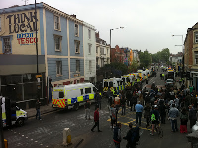 The police provoked this, says Infoshop News: "Turning up in this area of Bristol with such numbers, attacking Telepathic Heights and blatantly using public money to defend the interests of a corporate giant such as Tesco was always going to get a reaction".