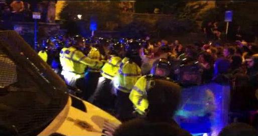 According to this source, the police pushed everyone fifty yards down the road (south) where a stand-off developed. To chants of "Whose street? Our street!", bins were thrown across the road to stop further police advance. Missiles thrown at their lines. At about 9.30pm (probably slightly later), the police baton charged and injured several demonstrators with strikes to the head.