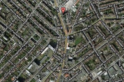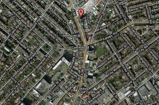 As the confrontation developed, the police found themselves centred on the complex junction comprising Ashley Road, Sydenham Road and Nine Tree Hill. With pressure from north and south, they were also being pelted from high up Nine Tree Hill (marked A on the satellite picture immediately above and picture below - Nine Tree Hill is on the left). They were at times visibly shaken.