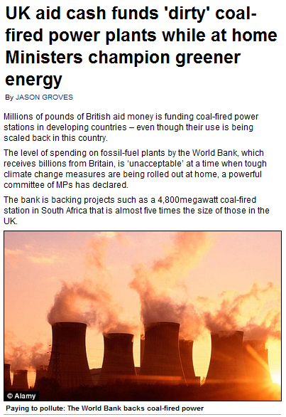 Millions of pounds of British aid money, the Daily Mail tells us, is funding coal-fired power stations in developing countries – even though their use is being scaled back in this country. It continues:
