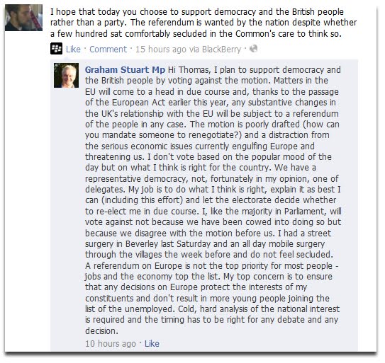 The MSM, of course, just doesn't get it, with the Failygraph letting Charles Moore loose on the subject. He follows the herd, arguing for a free vote on the EU referendum, he and his commenters unable to appreciate that this is classic displacement activity and a crass waste of time and money, in terms of achieving anything positive.